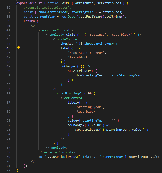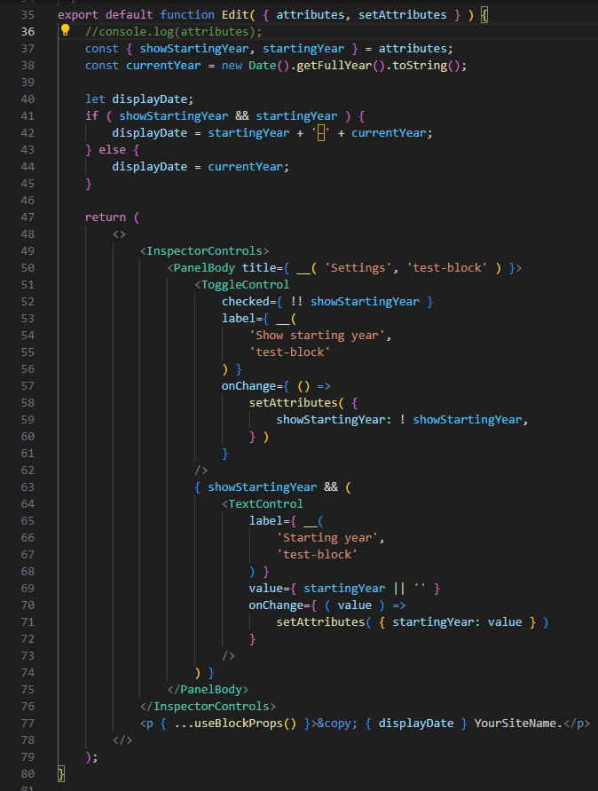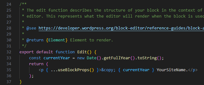 <p { ...useBlockProps() }>© { displayDate } YourSiteName.</p>