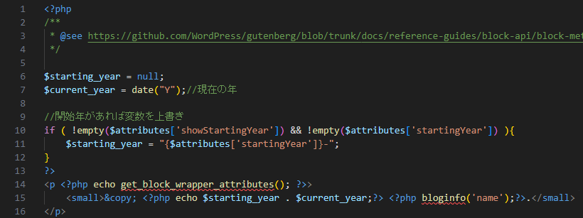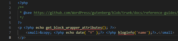 $block_content = '<p ' . get_block_wrapper_attributes() . '>© ' . esc_html( $display_date ) . ' ' . get_bloginfo('name') . '</p>';