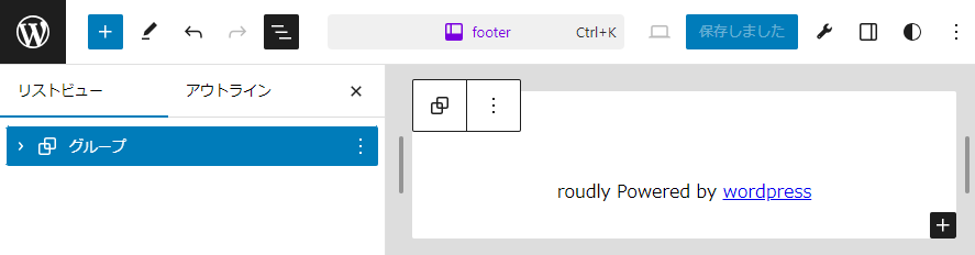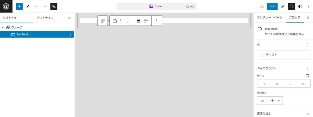 書き換えたら保存をし、Wordpress管理画面のfooterブロック編集画面を再読込します。情報が変わり、ツール類が増えていることを確認してください。