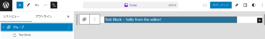 ここまでの変更を管理画面:ブロックを再読込して確認します。入力内容も保存されることも確認してください。