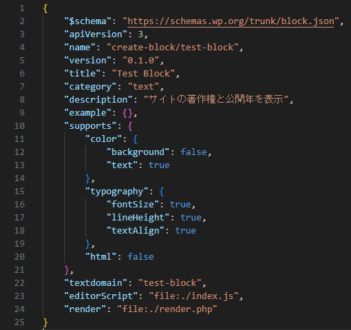 まず最初に、ブロックエディタの初期設定を行ったり、編集用のツール類を組み込みます。test-block/src/block.jsonをエディタで開きます。