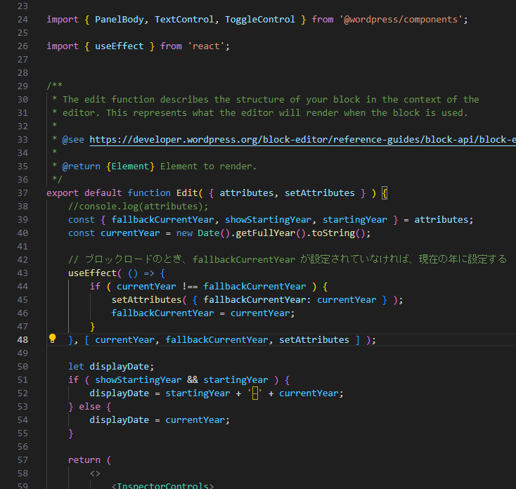 fallbackCurrentYearの値を設定する必要があります。edit.jsに記述をしていきます。なお、ReactのuseEffectはレンダーのあとに処理される。useEffectの詳しい解説はこちら。