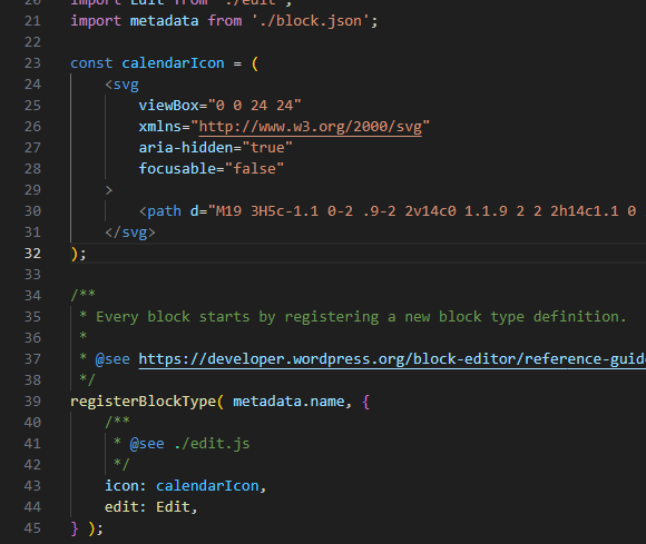 test-block/src/index.jsをエディターで開きます。index.jsはblock.jsonを受け取るプログラムです。アイコンとして規定サイズの24x24pxで作成したSVG画像のソースコードを直接埋め込みます。