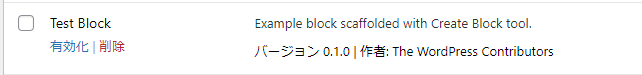 生成されたプラグインを有効化しておきます。有効化することで、今回生成したブロックの種がブロックリストに表示されます。
