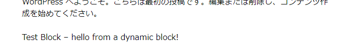 npx @wordpress/create-block@latest test-block --variant=dynamicOk to proceed? (y)などとでたら、yを入力してエンターキーを押してください。種のインストールが始まります。インストールは数分かかります。インストールが終わったら次へ。pluginsディレクトリに、開発用のtest-blockディレクトリと管理画面のプラグインにTest Blockが出来ました。